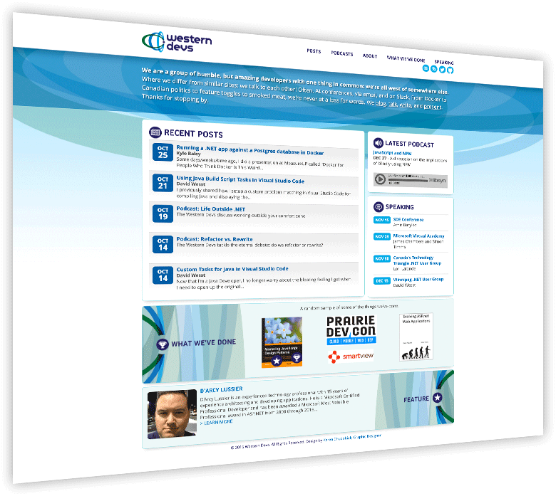 Western DevsOverview: Westerndevs.com, is a community of developers that talk to each other at conferences, via email, and on Slack. Westerndevs.com is a good representation of what they hope to achieve in the general .NET community via blogging, talking, writing, and presenting.Project Responsibilities: Karen was responsible for the design and development of a logo and website template which includes execution of and consultation on the following: design, layout; colour, font; website architecture, design and layout; website coding in HTML, PHP, and CSS, send files to Client for in-house development.