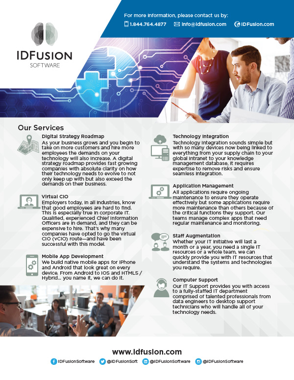 Overview: ID Fusion is a digital transformation company with three specific groups of customers: Fast growing small-to-medium sized companies that need help planning, researching, building, integrating or maintaining new and emerging tech their company needs to continue their growth; Large multinational organizations that are looking for expertise in mobile to help them build, enhance, and maintain mobile applications; and Government organizations that require resources to help them enhance and maintain their existing applications.