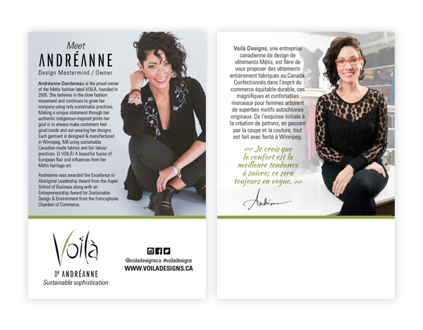 Overview: Voilà Designs’ clothing lines honour Canada’s French, Indigenous, and Métis character. With hints of Prairie culture, notes of the North, and shades of the Pacific Northwest, Voilà Designs' artistry and workmanship shine a light on one of the greatest countries in the world.