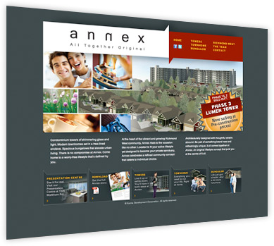 Annex CondosOverview: This project was spearheaded by TAG creative studios. Karen was responsible for the design and development of a website and collateral based on the previously designed Annex logo. The goal was to build the website and collateral to highlight the start of this new development and to generate sales to clients.The final design was prepped and sent to the website developer. Project Responsibilities: The project was a collaborative effort between Karen and TAG creative studios' creative director. TAG provided the photos, copywriting, specs, and project strategy and overview, web architecture, and feedback. Karen's responsibilities included execution of and consultation on the following: website architecture, design and layout; colour, font, and photo selection. The web design was then passed onto the web developer. Web design included: Web design & graphics generation |